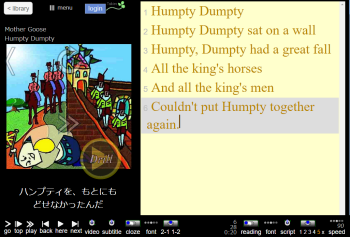 "Mother Goose" rhymes are fun with enormous educational values. Mother Goose rhymes develop and demonstrate how to combine media with reading and hand-on-activities to greatly reinforce learners’ outcomes. The method provides an effective reading practice with illustrated pictures that match the meaning of each phrase. Students can easily follow the reading path through an indicator track. In addition, a pause option helps students to recheck and confirm the sounds of unfamiliar vocabulary. Supported translation option is to support student self-study progress.
